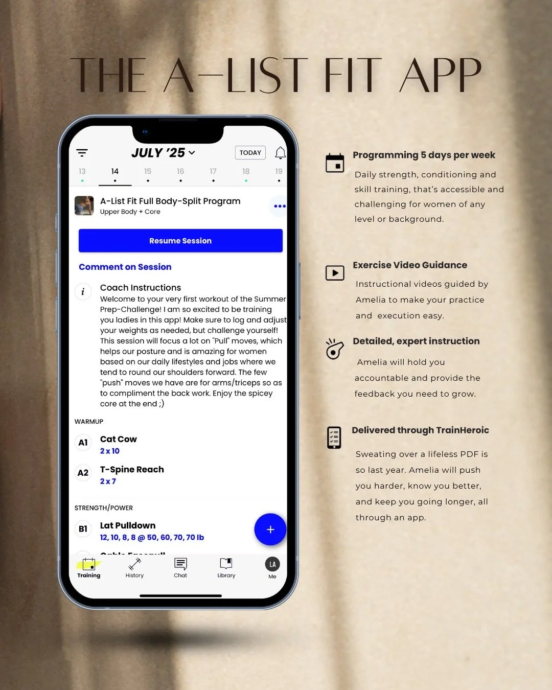 The A-List Fit App delivers personalized strength and conditioning programs designed for real women and real results. Get expert instruction, video demos, and progress tracking — all through TrainHeroic.